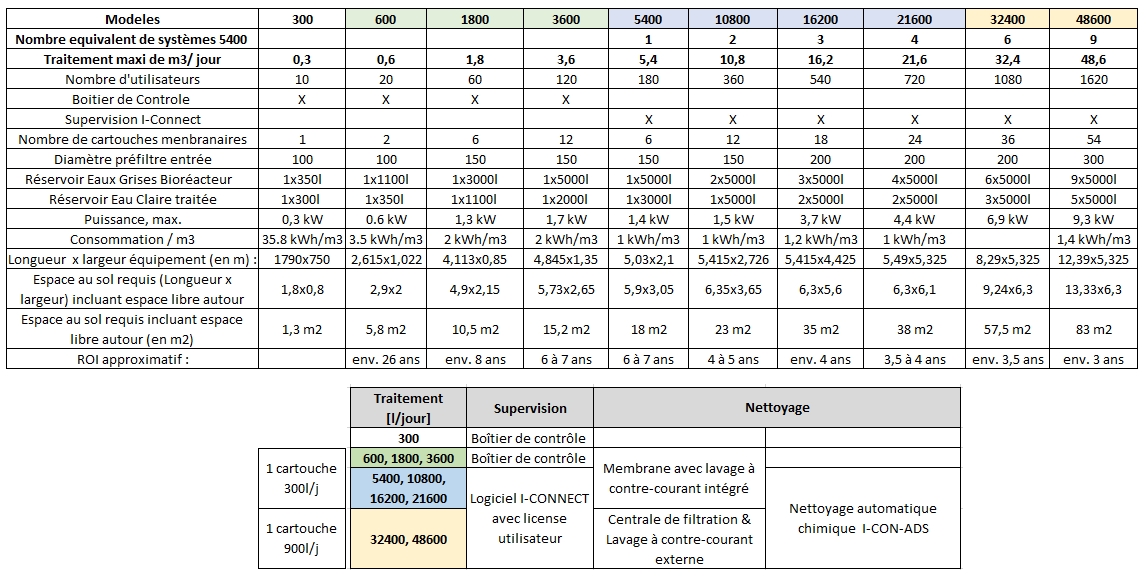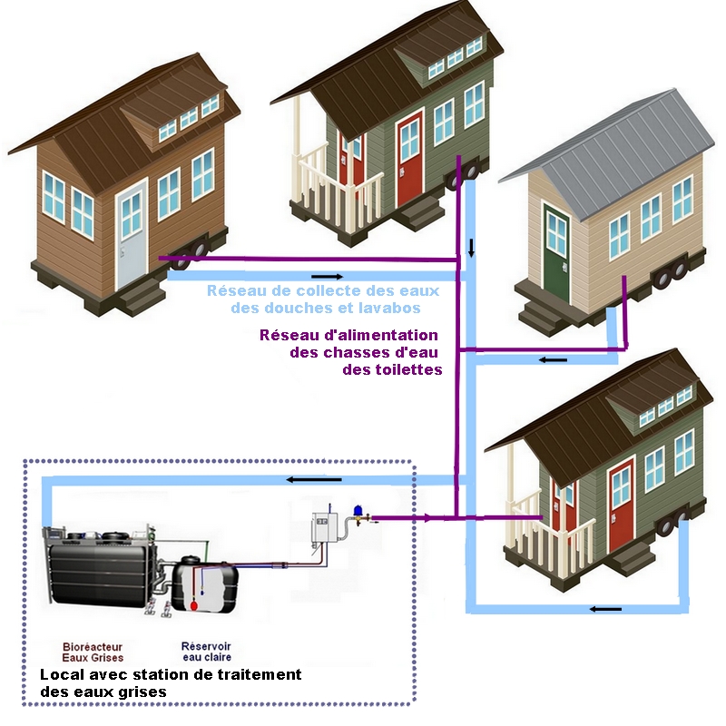 Par exemple, pour un ensemble centralisé traitant un ensemble de 120 logements, consommant quotidiennement 10 800 litres d’eau pour alimenter les chasses d’eau des WC (30 litres x 360 personnes), l’investissement pour les propriétaires serait inférieur à 1 000 €. Avec un prix moyen de l’eau potable de 4,5 €/m³ et probablement de 6 €/m³ sur la période d’amortissement (fourniture d’eau + assainissement + taxes), l’économie d’eau potable avec une station traitant 10 800 litres/jours serait de 3 942 m³/an (10,8 m³/jour x 365 jours), soit une économie annuelle de l’ordre de 24 000 € sur la facture d’eau potable et un ROI de l’ordre de 4,4 ans. A l’issue de la période d’amortissement, l’économie annuelle est de l’ordre de 20 000 €/an.